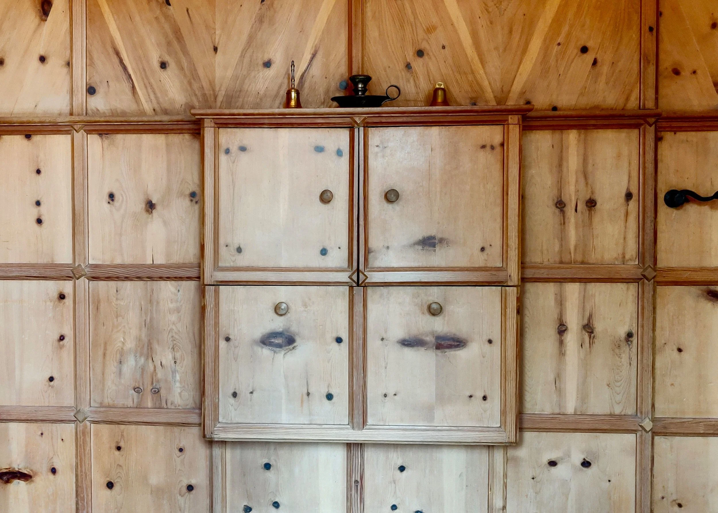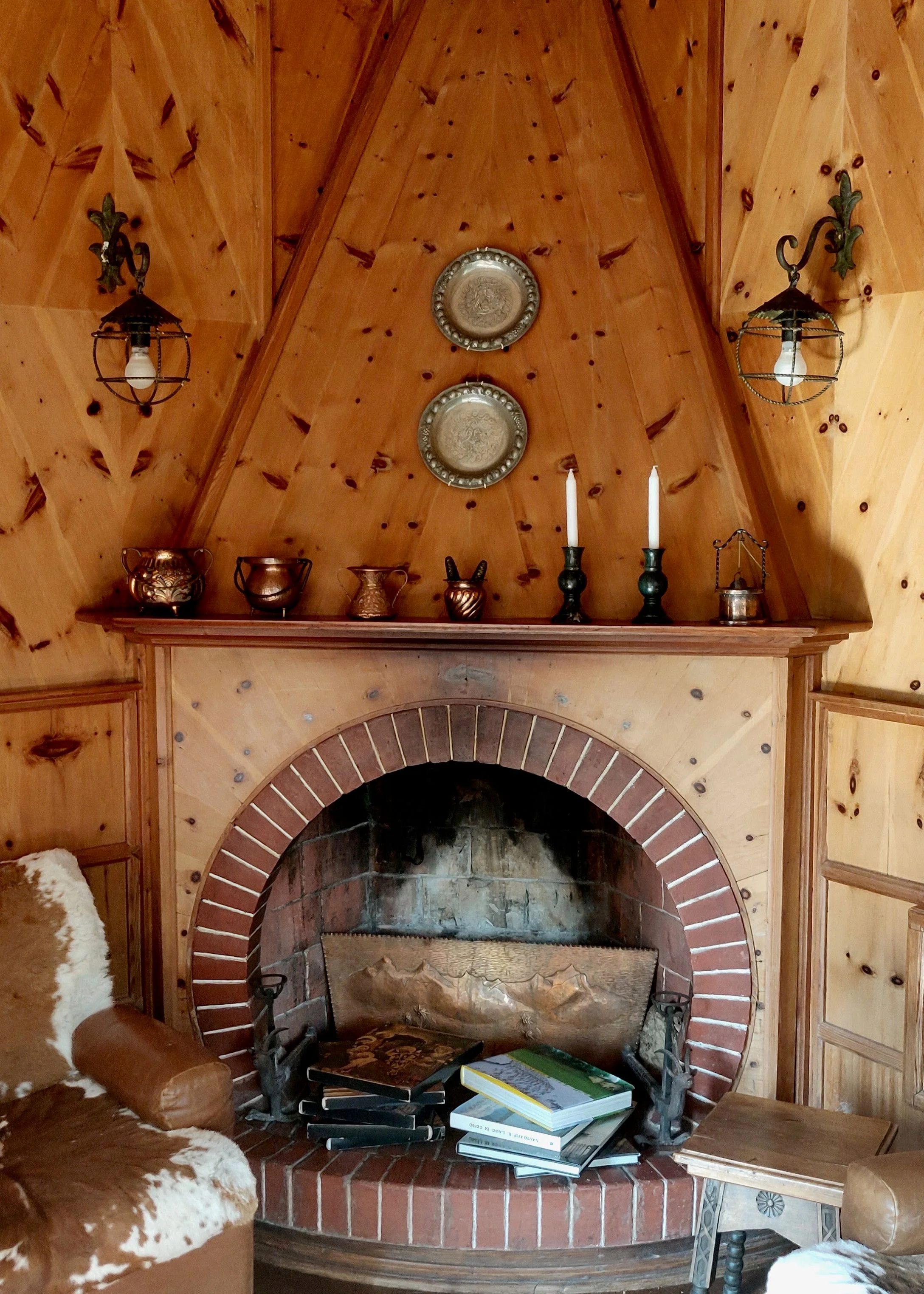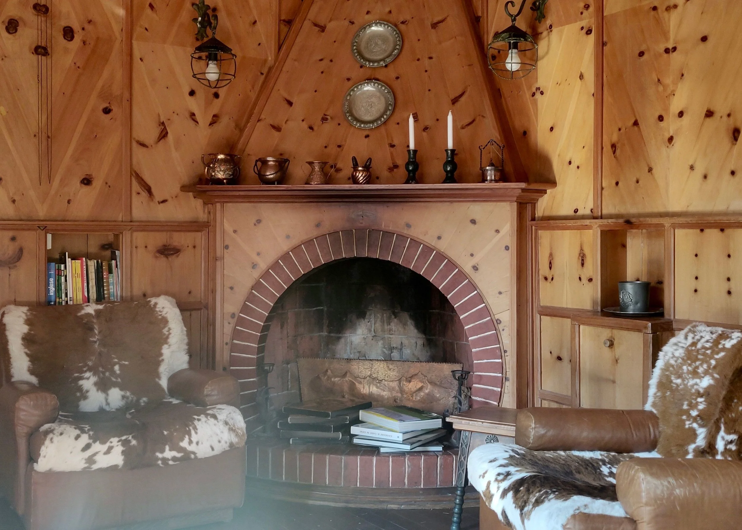 Salotto dalle pareti completamente ricoperte di legno con divani e poltrone originali.