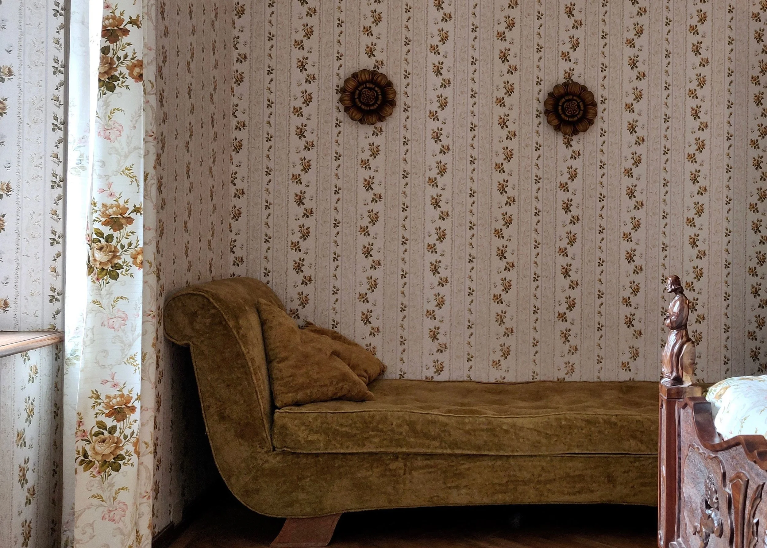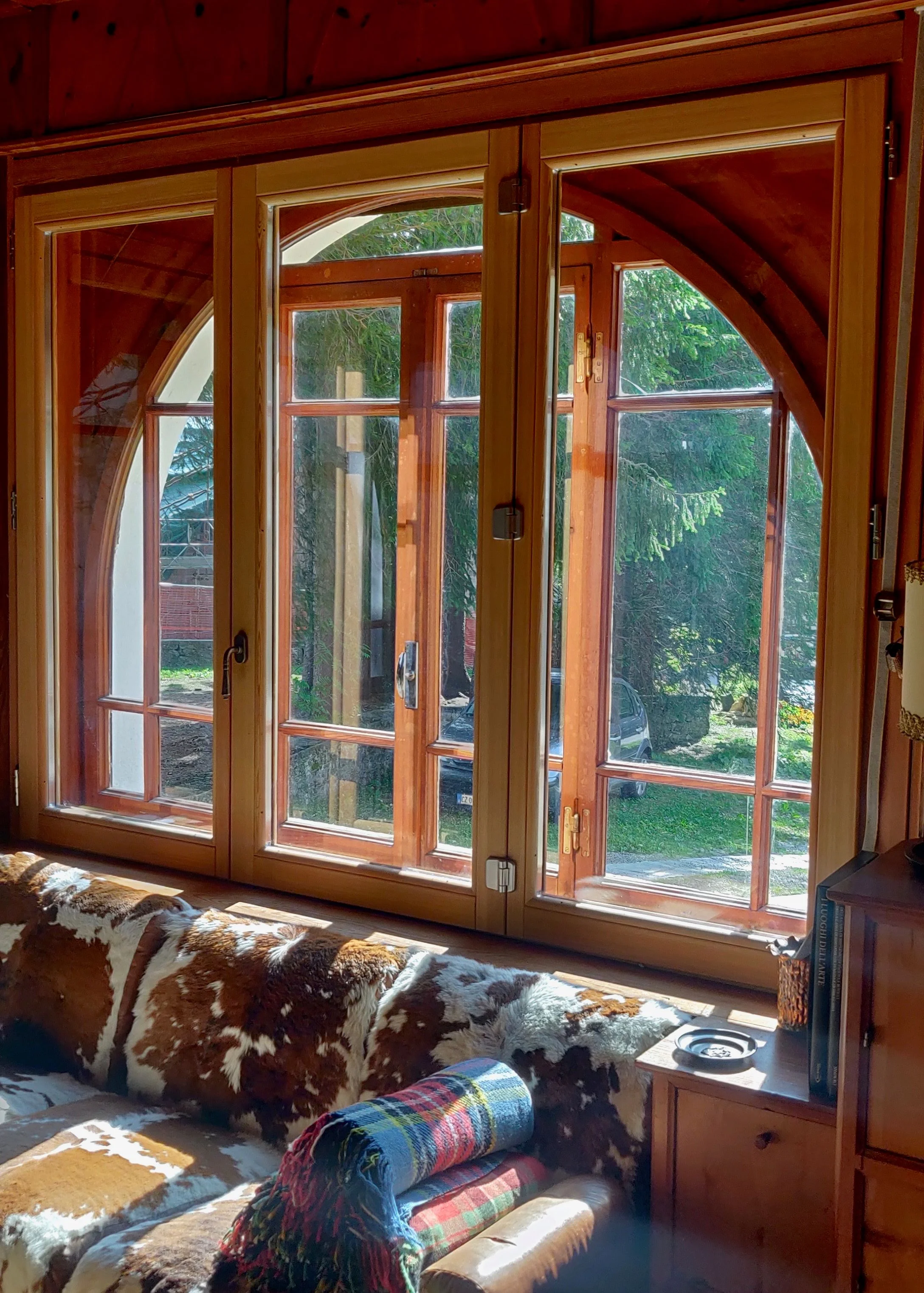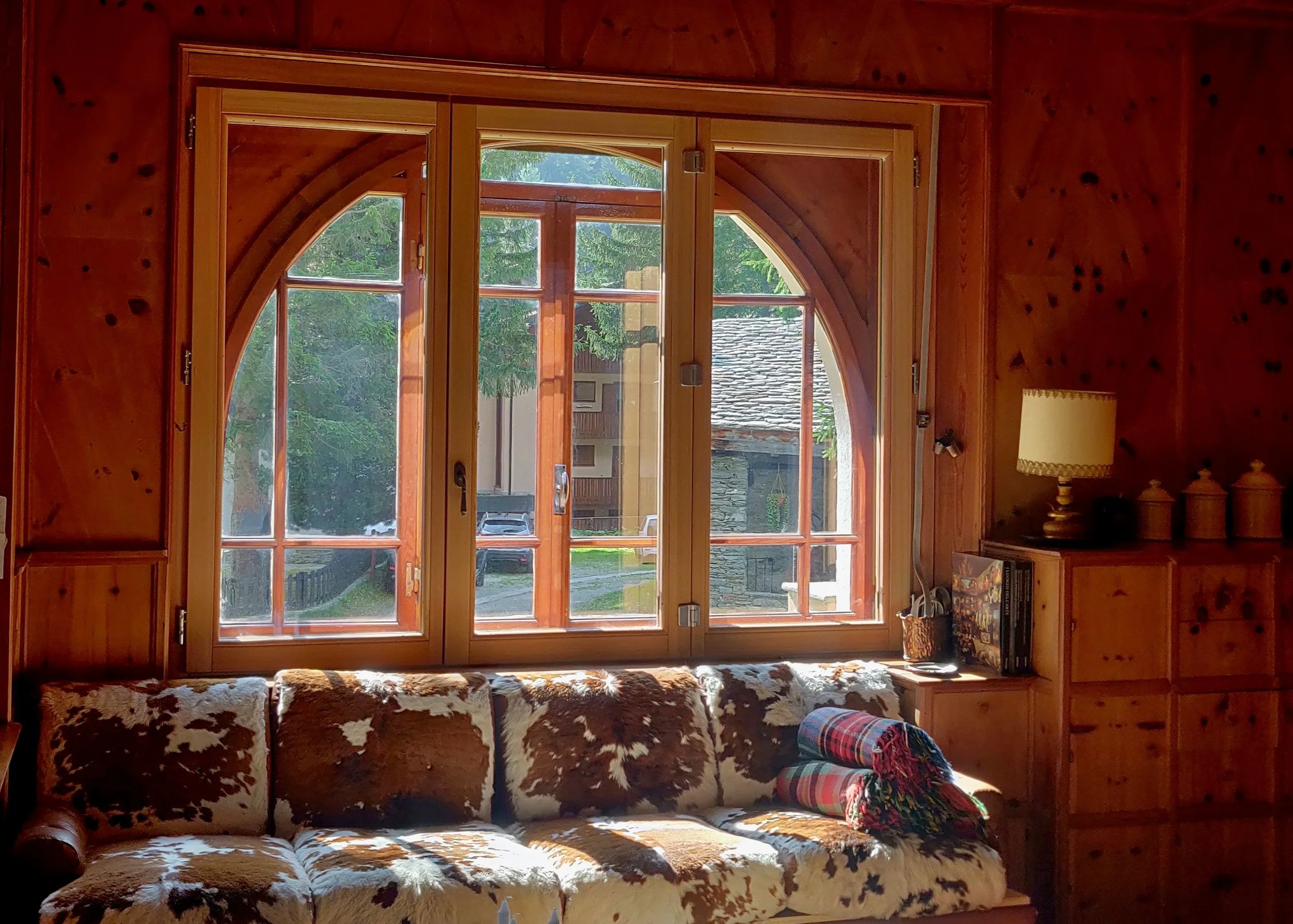 Salotto dalle pareti completamente ricoperte di legno con divani e poltrone originali.