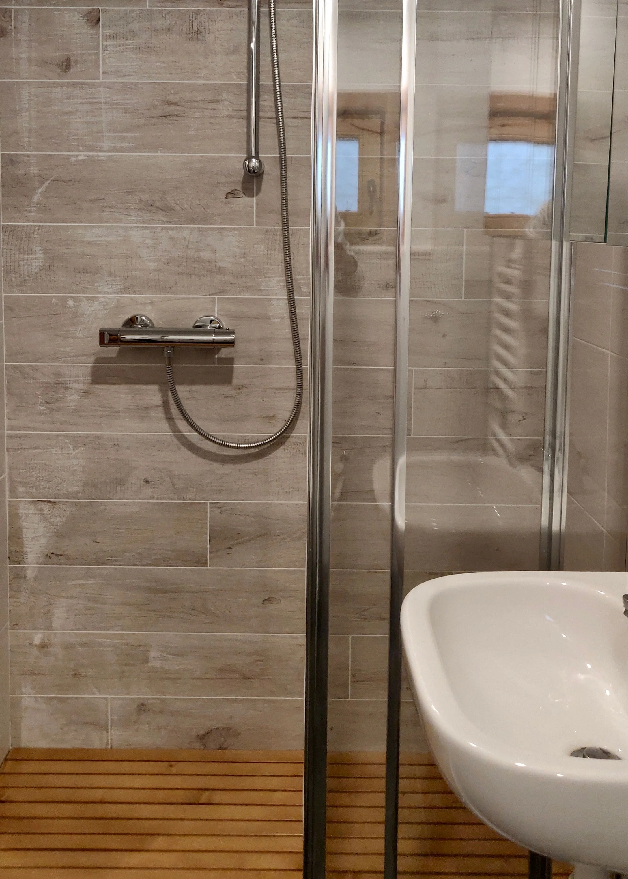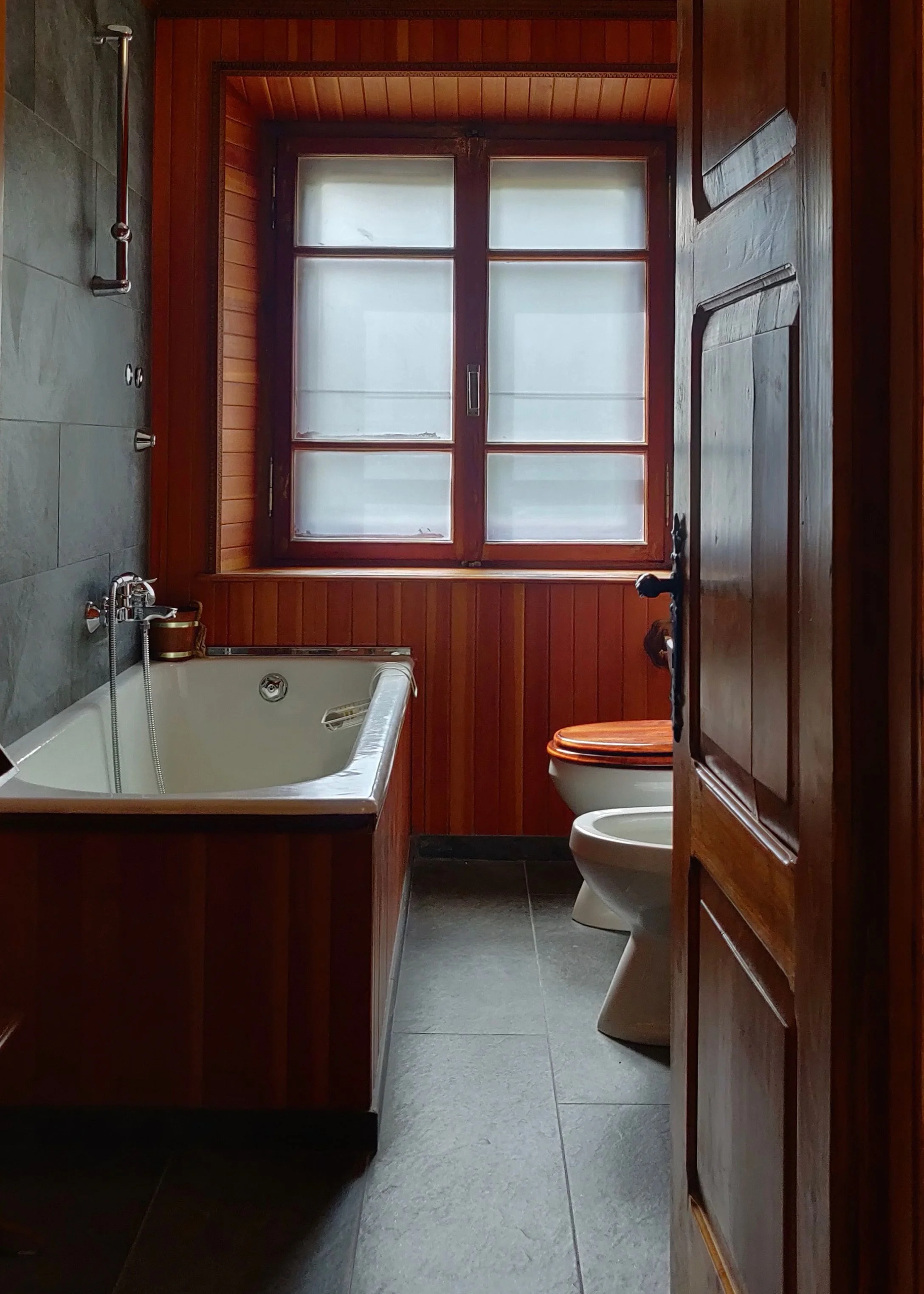 Il bagno al piano superiore è interamente in legno e pietra: la vasca da bagno è anche utilizzabile come doccia.